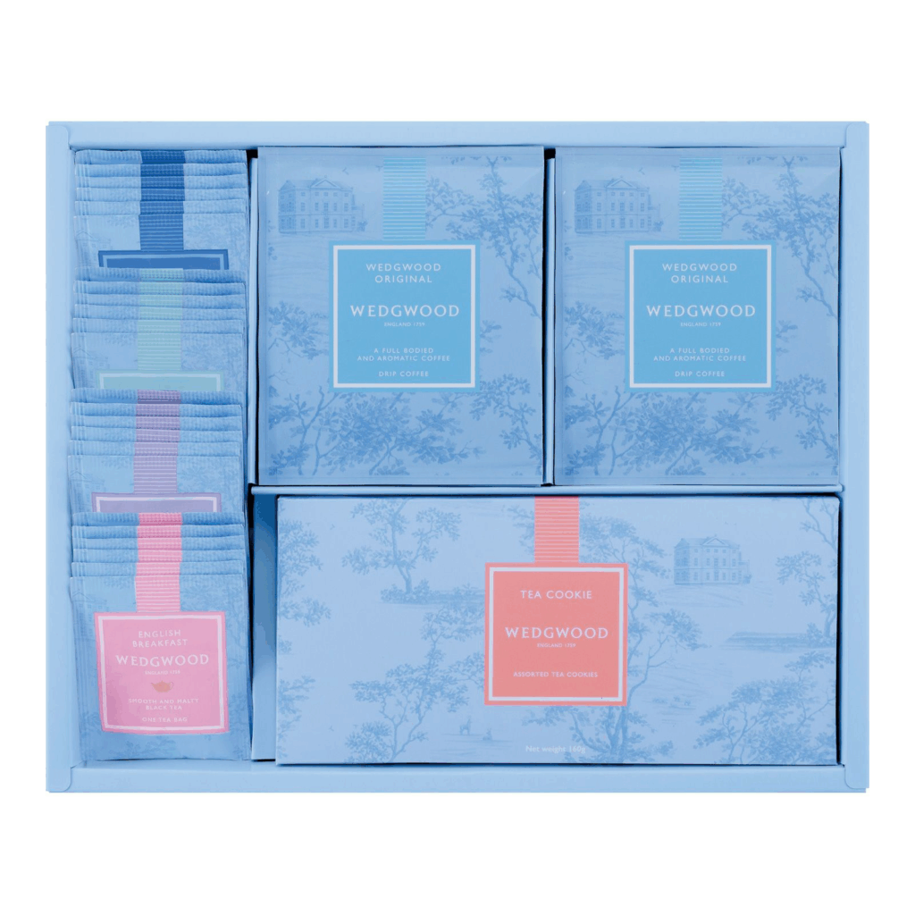 お茶うけにぴったりな茶葉入りのアップルティークッキーとレモンティークッキー2種に、ウェッジウッドならではの上品な味わいの紅茶と、中細挽きのドリップコーヒーのアソートセットです。