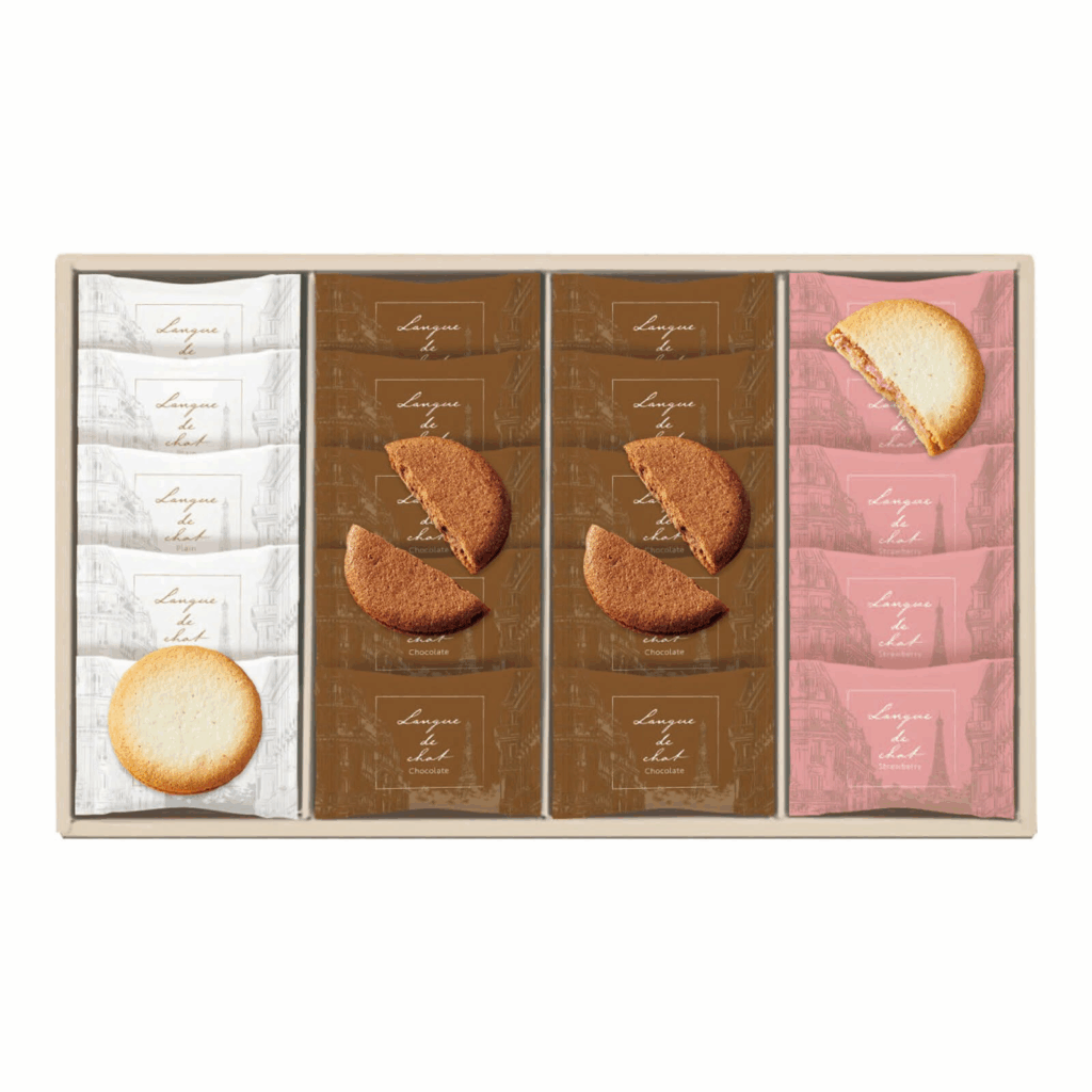 3つのフレーバーが魅力的なラングドシャが個包装になって入っています。お子さまから大人まで愛されるスイーツなので、おじいちゃん・おばあちゃんへのプレゼントにおすすめです。お茶やコーヒー・紅茶などと一緒にカフェタイムを楽しめるスイーツです。