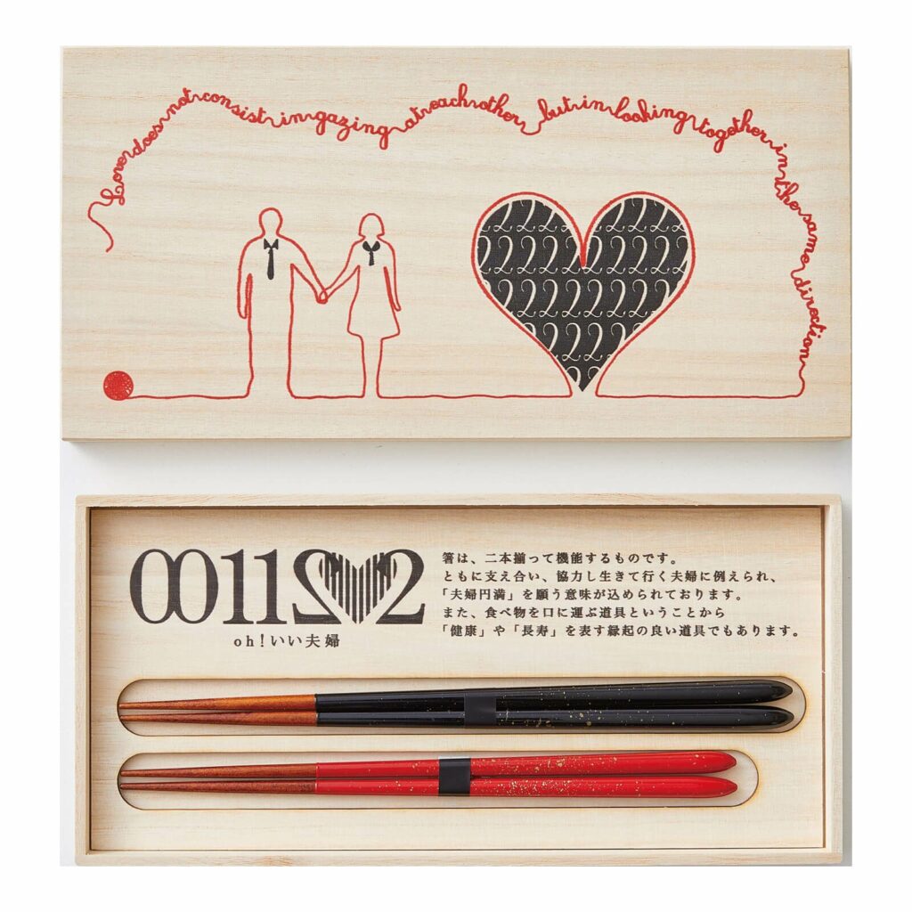 お箸は2本揃って1膳になることから、二人三脚で歩む夫婦に例えられ、円満祈願の贈りものとして人気です。いい夫婦の日にちなんだ11月22日の数字をロゴにした、縁起の良いギフトです。