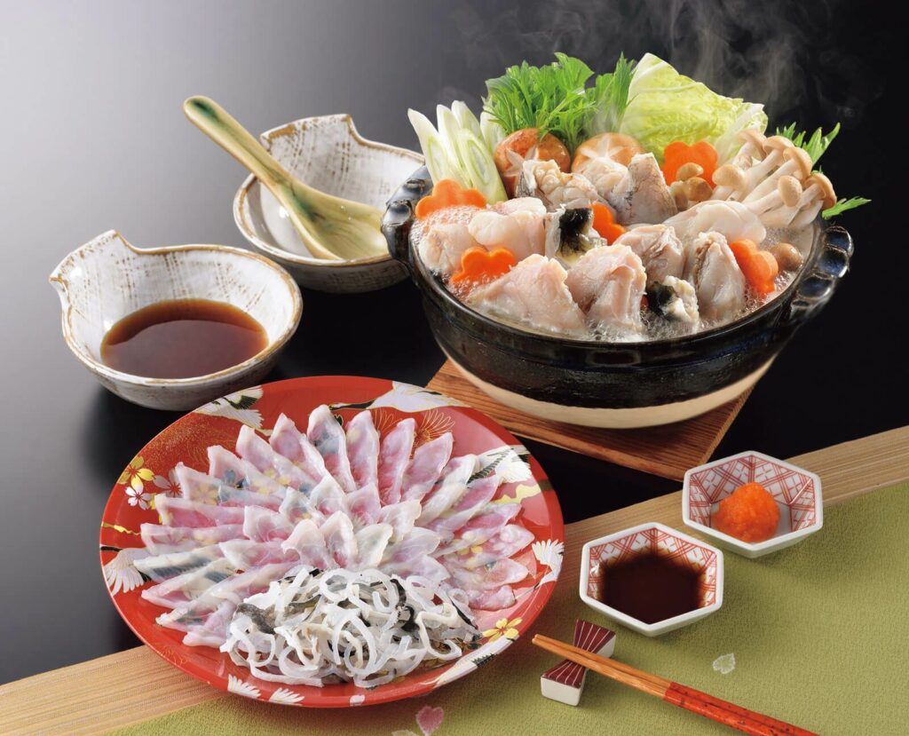下関の調理師達が1枚1枚丁寧に丹念に盛付けたお刺身とちり鍋用のとらふくちりのセットです。とらふぐの特徴はプリッとした食感と適度な弾力の中にも柔らかさがあります。またアラから出るダシは非常に美味。衣を付けて唐揚げにしてもおいしくお召し上がりいただけます。目と舌で楽しめる自慢の菊盛りをぜひ一度、ご賞味ください。ふぐの本場・下関より真心こめて贈ります。