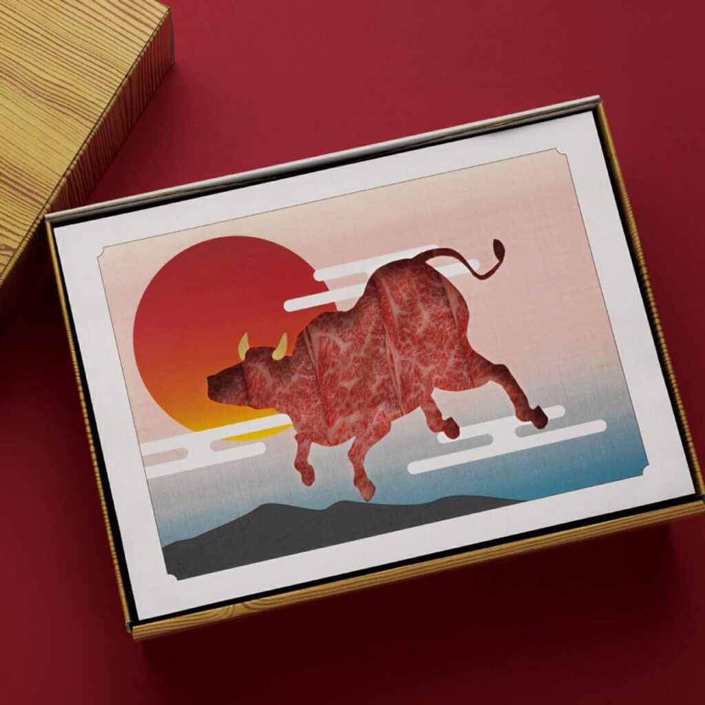 見た目にも華やかな神戸牛のセットです。牛の形に切り抜かれたアート台紙により、神戸牛の美しい「サシ」と暁をイメージしたアートが一体となり特別感あふれるギフトに仕上がりました。