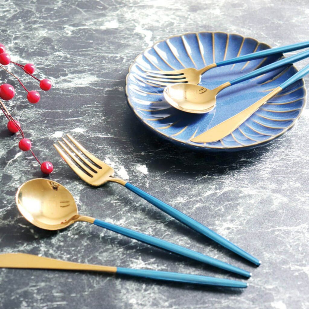 煌びやかな金色と、ブルーの組合せが魅力的なカトラリーセット。デザイン性が高くシンプルな食器と合わせたり、華やかな金縁のプレートと揃えても素敵です。空のブルーや常夏のビーチを想わせるリゾート感も、食卓をいっそう華やかにしてくれます。手触りの良さも格別で、パスタ、サラダ、カレーなど幅広い用途でご活用いただけます。