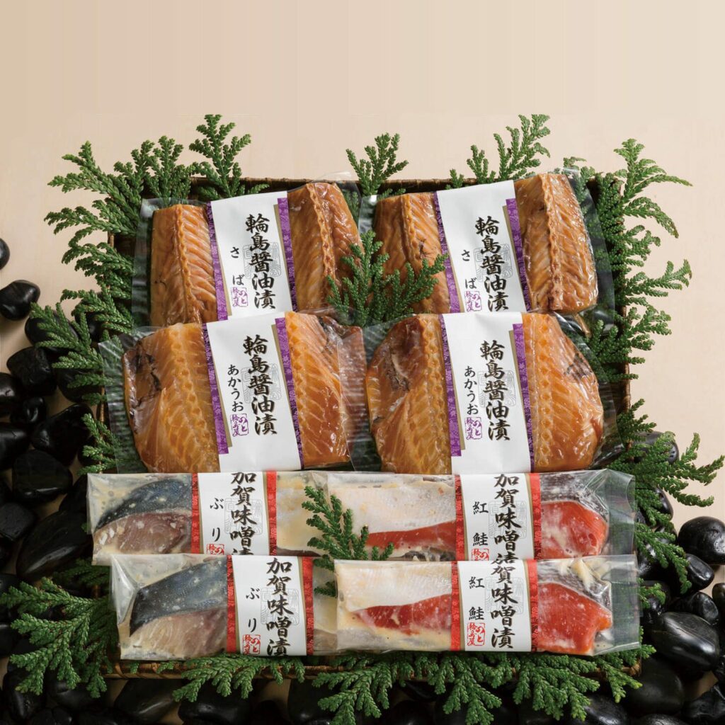 城下町金沢で江戸時代創業の老舗醤油蔵が作る甘みのある醤油だれにじっくりと漬け込んだ赤魚切身醤油漬けとさば切身醤油漬け、米こうじを多く使い長期間熟成させた濃厚な味とコクが特徴の加賀味噌を使った紅鮭加賀味噌漬とぶり加賀味噌漬をセットにしました。ご飯のおかずにぴったりなお魚セットです。