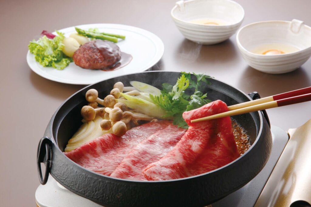 松阪牛を使用したハンバーグとリブロースのすき焼きの贅沢なセットです。