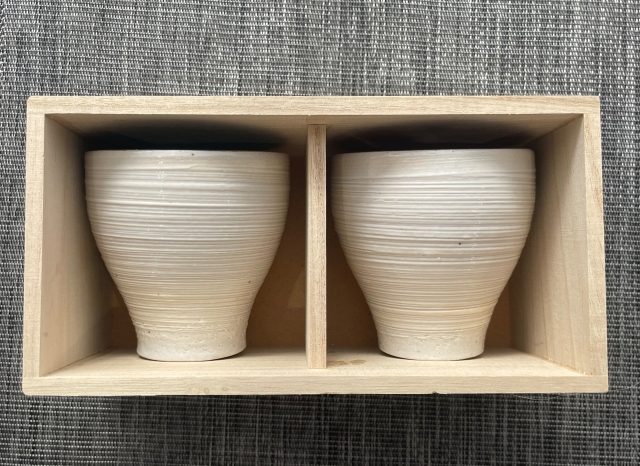 ダブルウォール構造により、保温性に優れ、冷たいものも温かいものも飲み頃温度を保ちます。透かし彫りの木箱入りで、一層高級感に溢れます。たっぷり350ml入るところも魅力的です。
