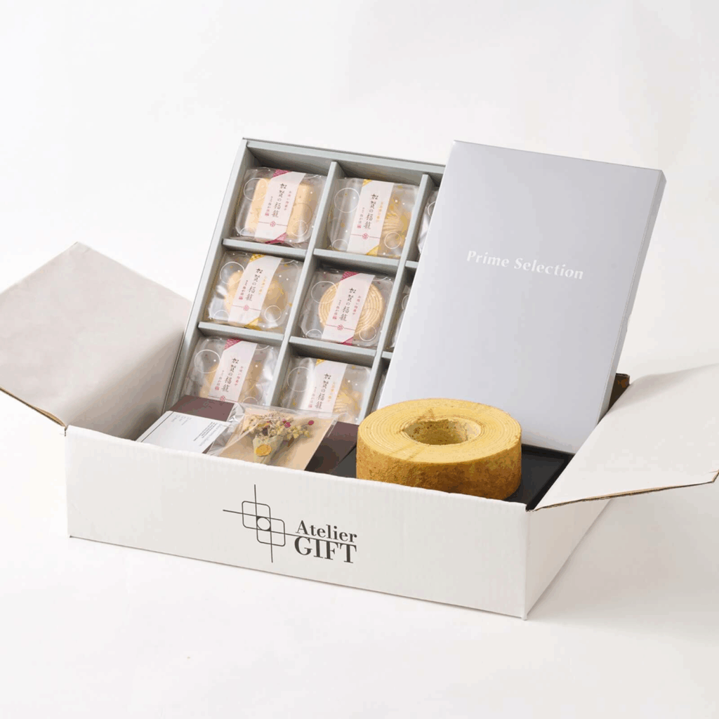 累計900万冊突破の定番カタログギフト「PRIME SELECTION」、お湯を注ぐだけの高級感漂う「お吸い物・お茶漬け最中詰合せ」、幸せを願うという意味がある「バウムクーヘン」と季節の象徴を映し出す当店オリジナルのドライフラワーをセットにした高級感あふれるAtelier GIFTオリジナルセットです。