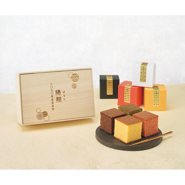 京都三源庵のキューブタイプのカステラ4種(プレーン・宇治抹茶・ショコラ・いちご)を高級感のある桐箱に詰めました。