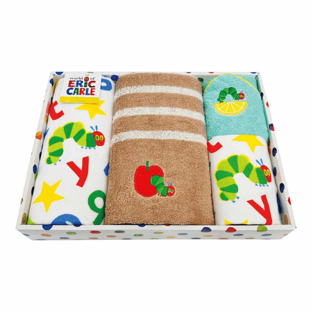 大人から子どもまで世界中で愛されている絵本「はらぺこあおむし」の、鮮やかな色使いやモチーフがつまったタオルセットです。