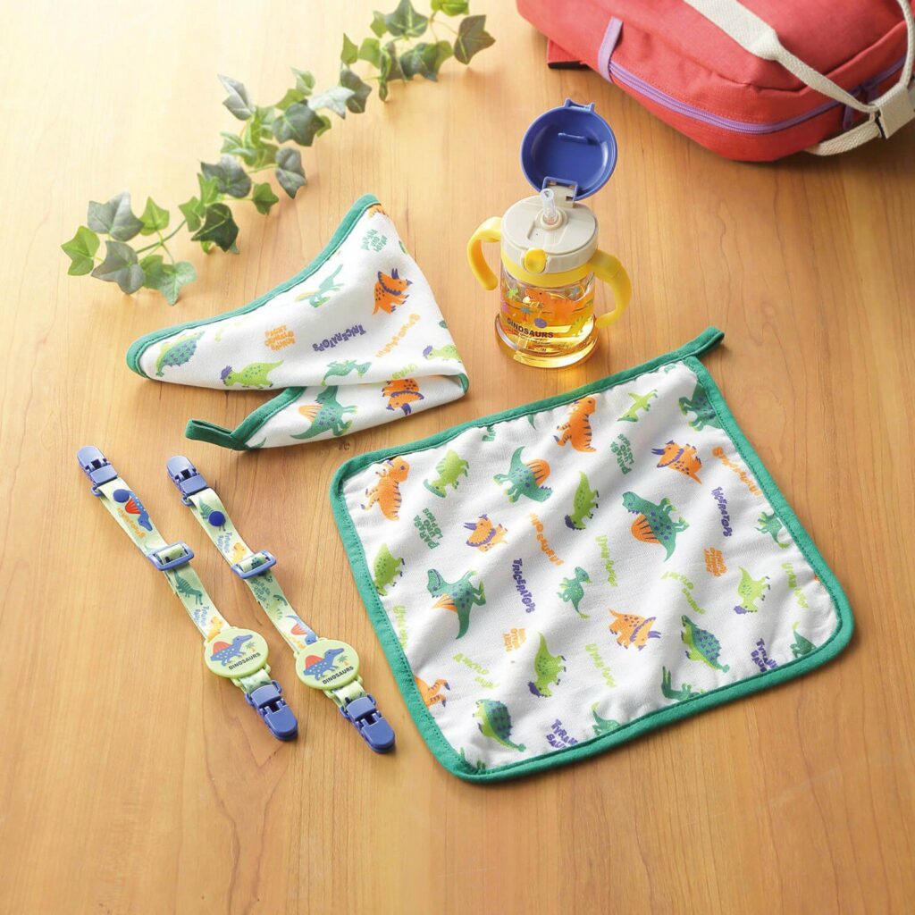 恐竜柄で、赤ちゃんにやさしい綿100%のループ付きハンドタオル、ベビーカーや車のヘッドレストなどに使えるマルチクリップ、1才ごろからのストローを使った飲むトレーニングにぴったりなストローマグが入っているので、男の子への出産祝いにおすすめです。