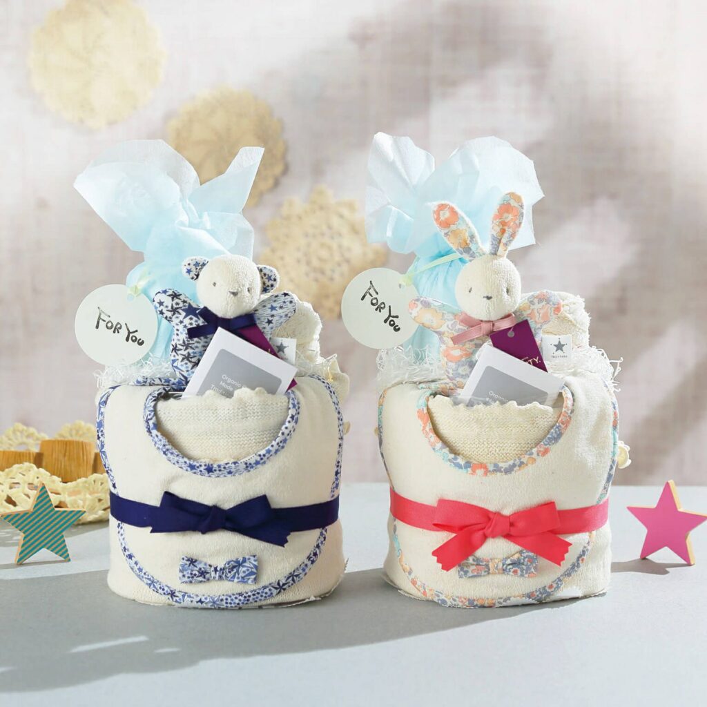 オーガニックコットン使用のスタイ・ラトル・腹巻・今治産オーガニックタオルとパンパースSサイズ10枚をセットにしたおむつケーキ。