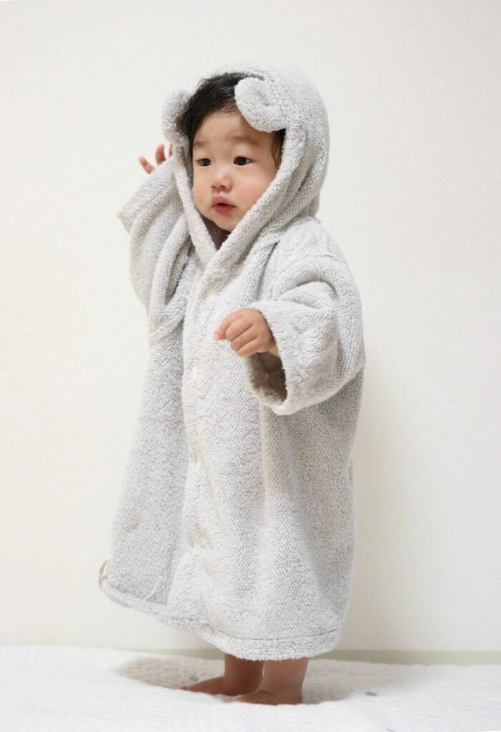 お風呂上がりや水遊び、レジャーなどでサッと羽織らせるだけで、元気な赤ちゃんを湯冷めから守ります。フード付きで頭までしっかり拭けるのも嬉しいポイント。