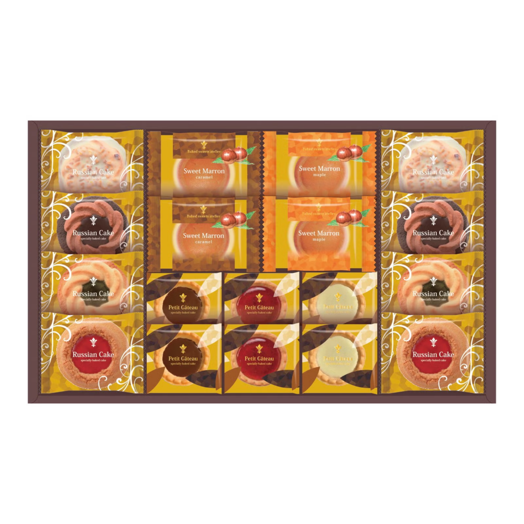 60年以上にわたり愛され続ける中山製菓の焼き菓子の詰合せです。スイートマロン、ロシアケーキ、プチガトーの3種類を詰合せ、色とりどりの焼き菓子を楽しめます。