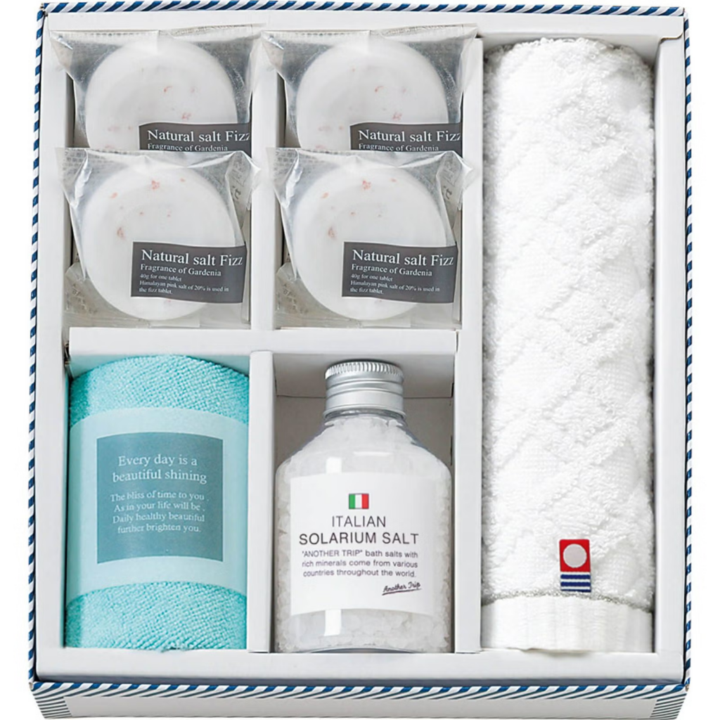 世界の国から集めた大自然の恵みいっぱいのバスソルトをボトルに詰め込んでセットにしました。バスソルトには天然塩を使用しているので、海の豊富なミネラルによる肌の保湿などの美肌効果が期待できます。さらに柔らかく手触りが気持ちいいマイクロファイバークロスと今治のウォッシュタオルもセットにしました。