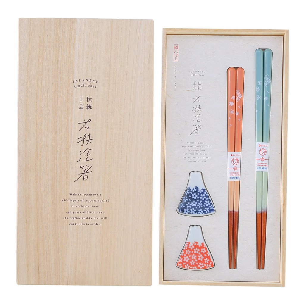 天然木に漆を塗り重ねた若狭塗のお箸で、丈夫で使いやすく手にしっとりと馴染んでくれます。陶器製の箸置きは日本を代表する「富士山」の絵柄で、成功や繁栄といった縁起の良い意味を持ち人気のデザインです。