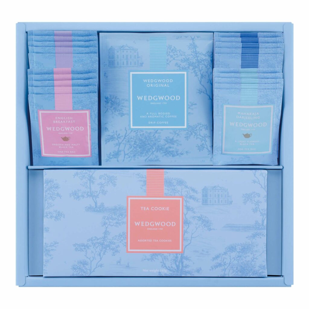 世界的な陶磁器ブランド「ウェッジウッド」が手掛ける、紅茶と焼き菓子のギフトセットです。上品な味わいの紅茶、ドリップコーヒー、そして2種類のティークッキーが詰め合わされており、優雅なティータイムを気軽にご家庭で楽しめます。
