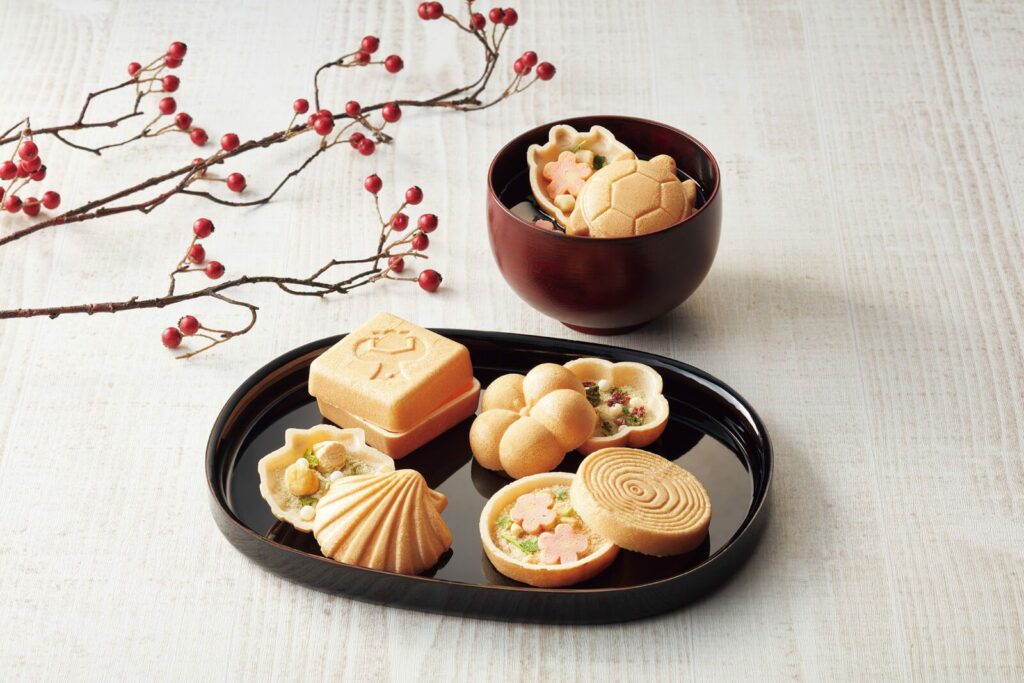 金沢の職人が焼き上げた香ばしい最中の中に、滋味深いお吸い物とお茶漬けを包み込んだ、見た目も美しい「加賀の福籠」。