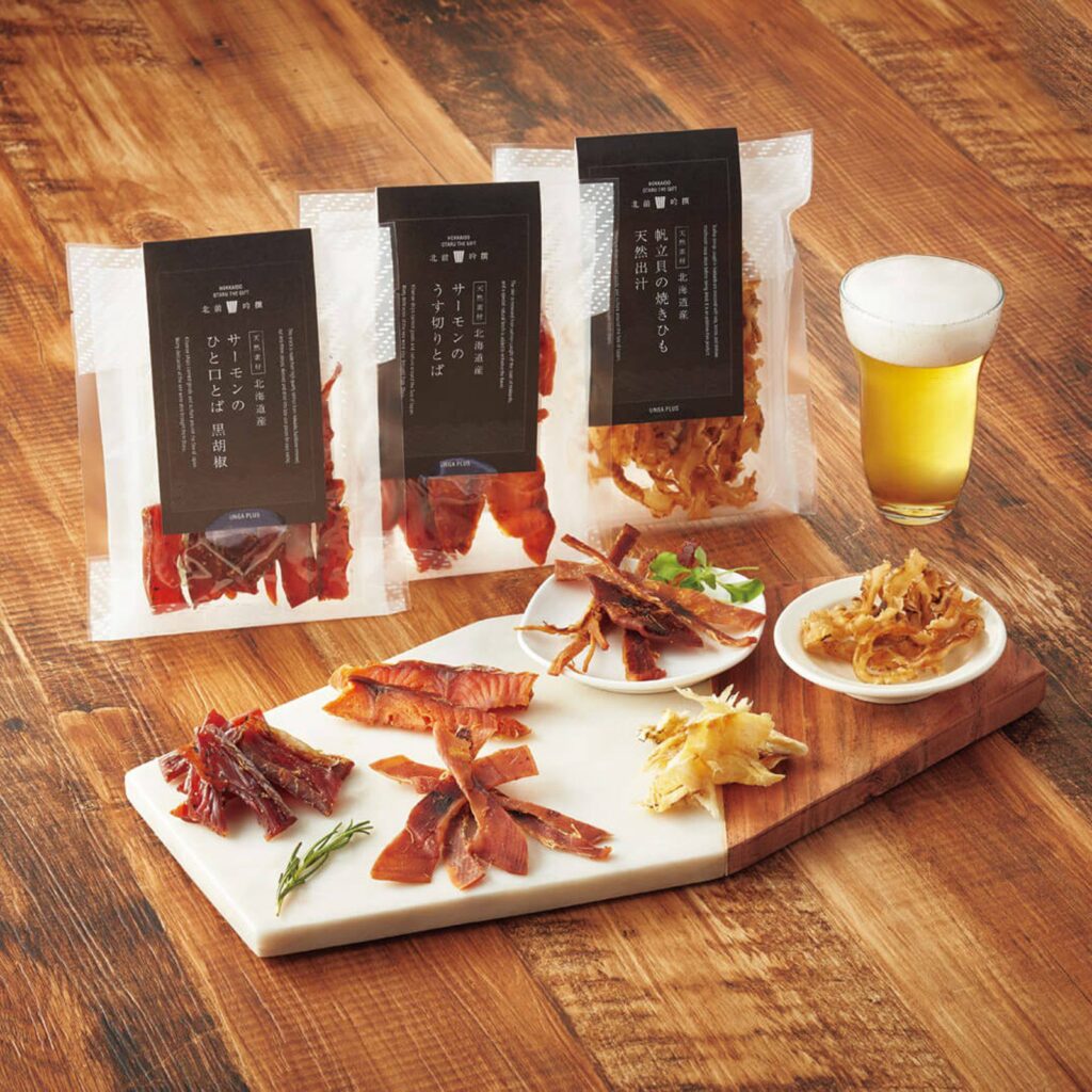 北海道の海の幸を贅沢に使用した、小樽百貨UNGA↑の海産珍味セット。 かつての北前船の歴史を背景に持つこの逸品は、素材本来の旨みが凝縮されており、お酒好きの方にはたまらない深い味わいです。
